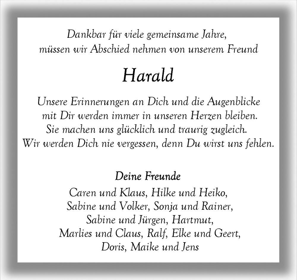 Hier finden Sie alle Traueranzeigen aus der Zeitung, die bisher für Harald erschienen sind. Weitere Traueranzeigen, die in der Zeitung erscheinen, werden hier ebenfalls aufgelistet