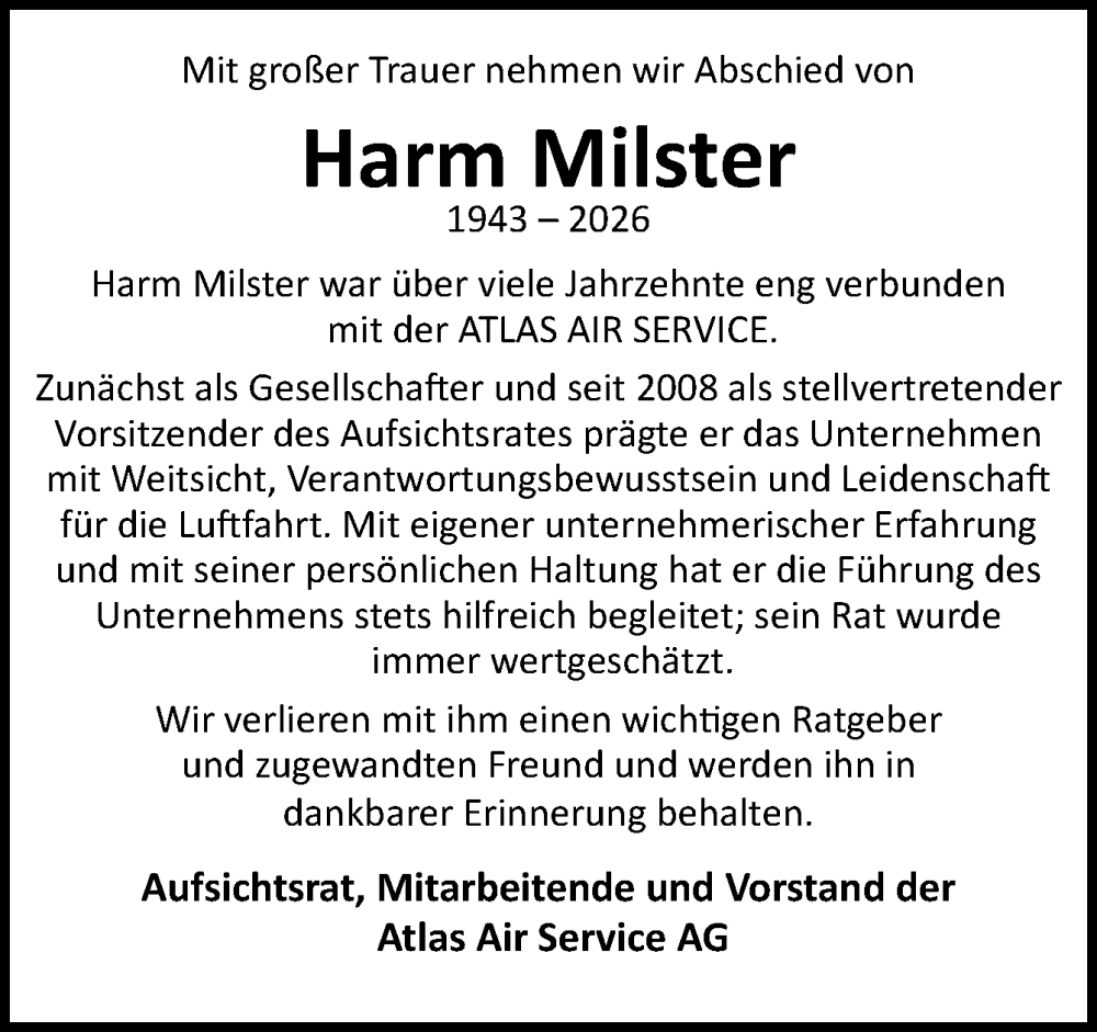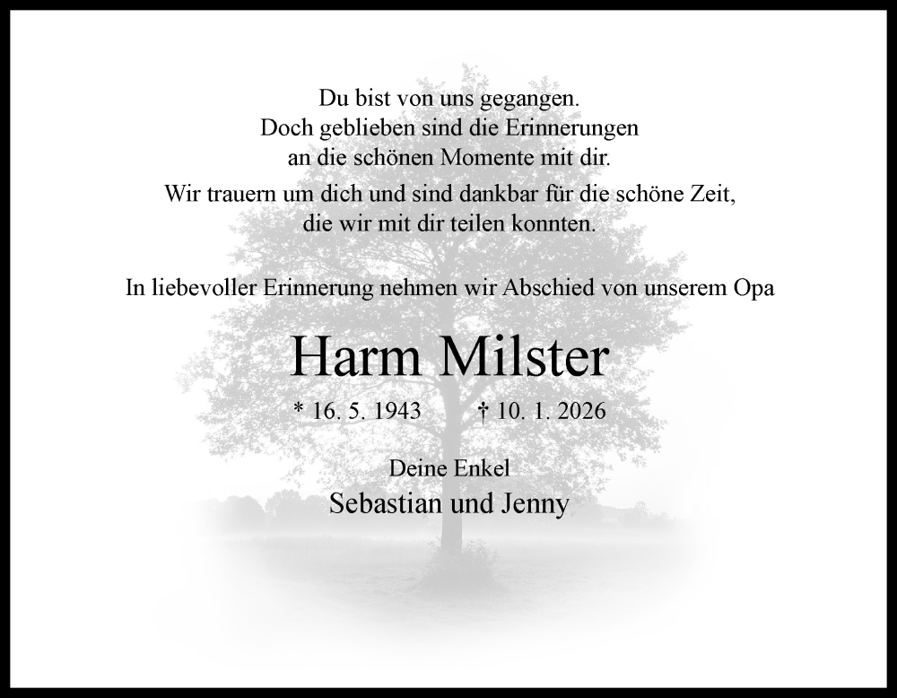 Hier finden Sie alle Traueranzeigen aus der Zeitung, die bisher für Harm Milster erschienen sind. Weitere Traueranzeigen, die in der Zeitung erscheinen, werden hier ebenfalls aufgelistet