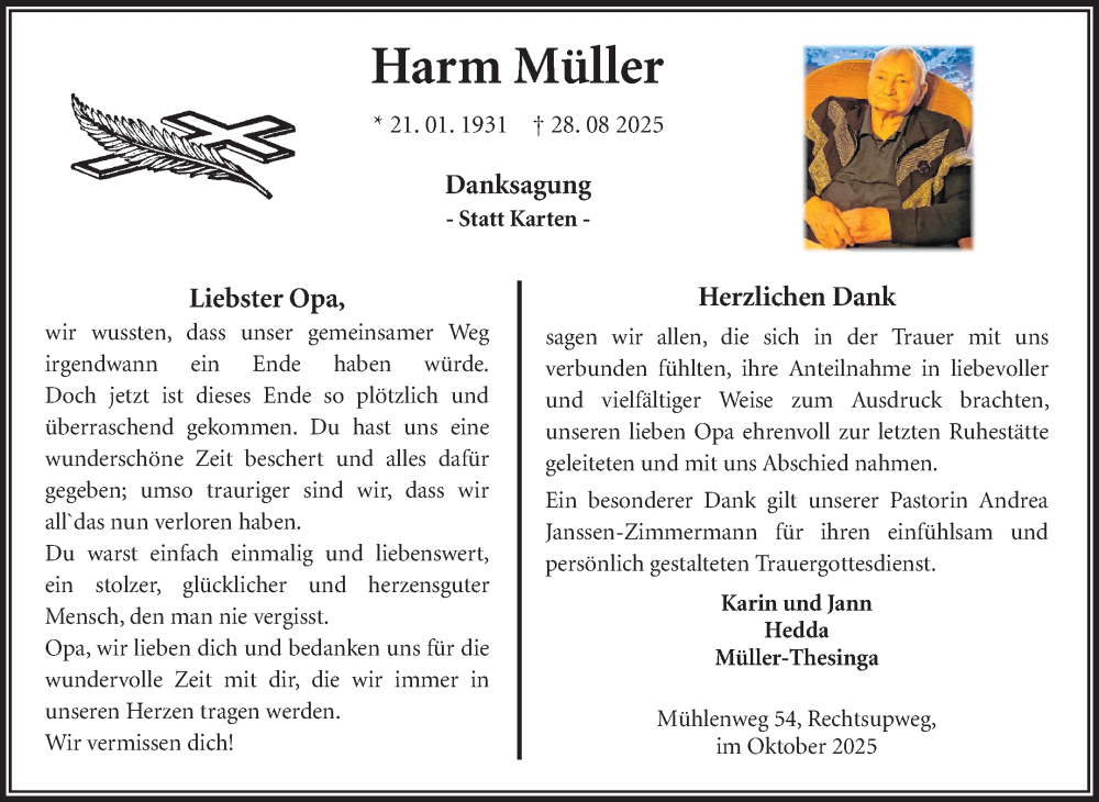 Hier finden Sie alle Traueranzeigen aus der Zeitung, die bisher für Harm Müller erschienen sind. Weitere Traueranzeigen, die in der Zeitung erscheinen, werden hier ebenfalls aufgelistet