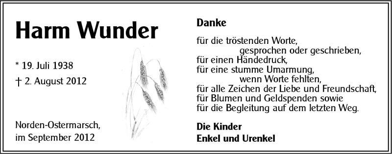 Hier finden Sie alle Traueranzeigen aus der Zeitung, die bisher für Harm Wunder erschienen sind. Weitere Traueranzeigen, die in der Zeitung erscheinen, werden hier ebenfalls aufgelistet
