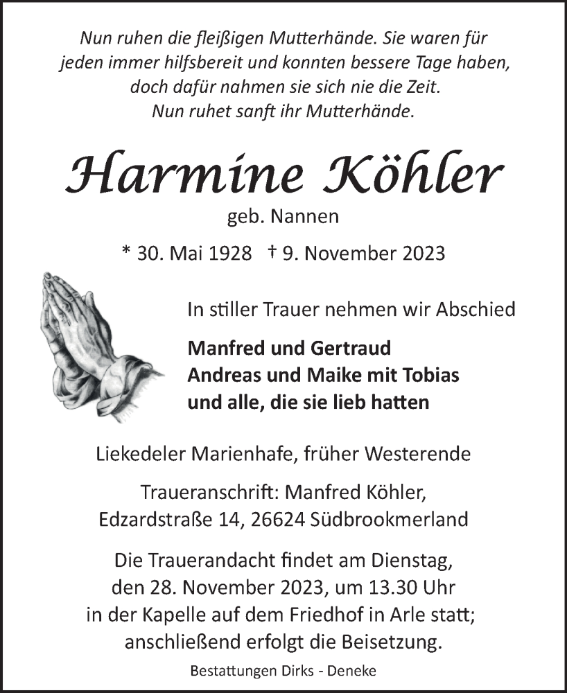 Hier finden Sie alle Traueranzeigen aus der Zeitung, die bisher für Harmine Köhler erschienen sind. Weitere Traueranzeigen, die in der Zeitung erscheinen, werden hier ebenfalls aufgelistet