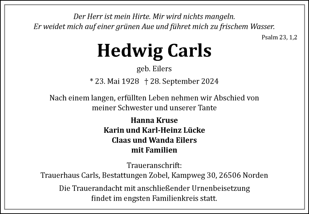 Hier finden Sie alle Traueranzeigen aus der Zeitung, die bisher für Hedwig Carls erschienen sind. Weitere Traueranzeigen, die in der Zeitung erscheinen, werden hier ebenfalls aufgelistet