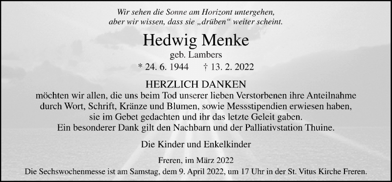Hier finden Sie alle Traueranzeigen aus der Zeitung, die bisher für Hedwig Menke erschienen sind. Weitere Traueranzeigen, die in der Zeitung erscheinen, werden hier ebenfalls aufgelistet