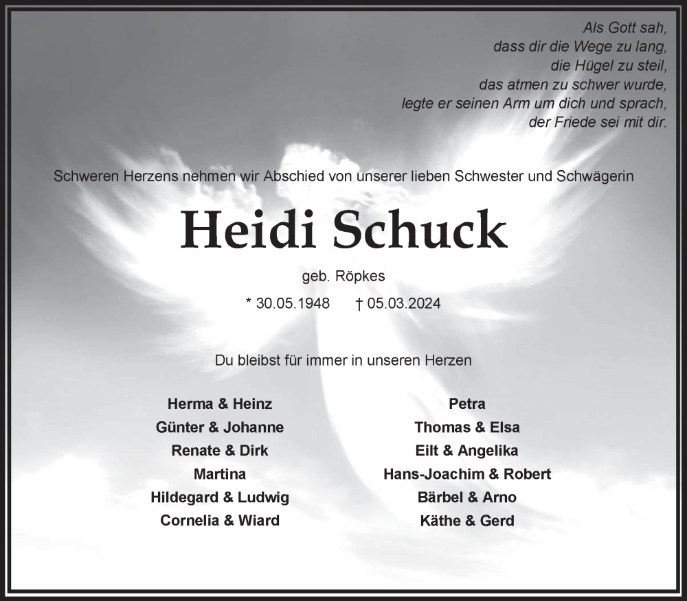 Hier finden Sie alle Traueranzeigen aus der Zeitung, die bisher für Heidi Schuck erschienen sind. Weitere Traueranzeigen, die in der Zeitung erscheinen, werden hier ebenfalls aufgelistet