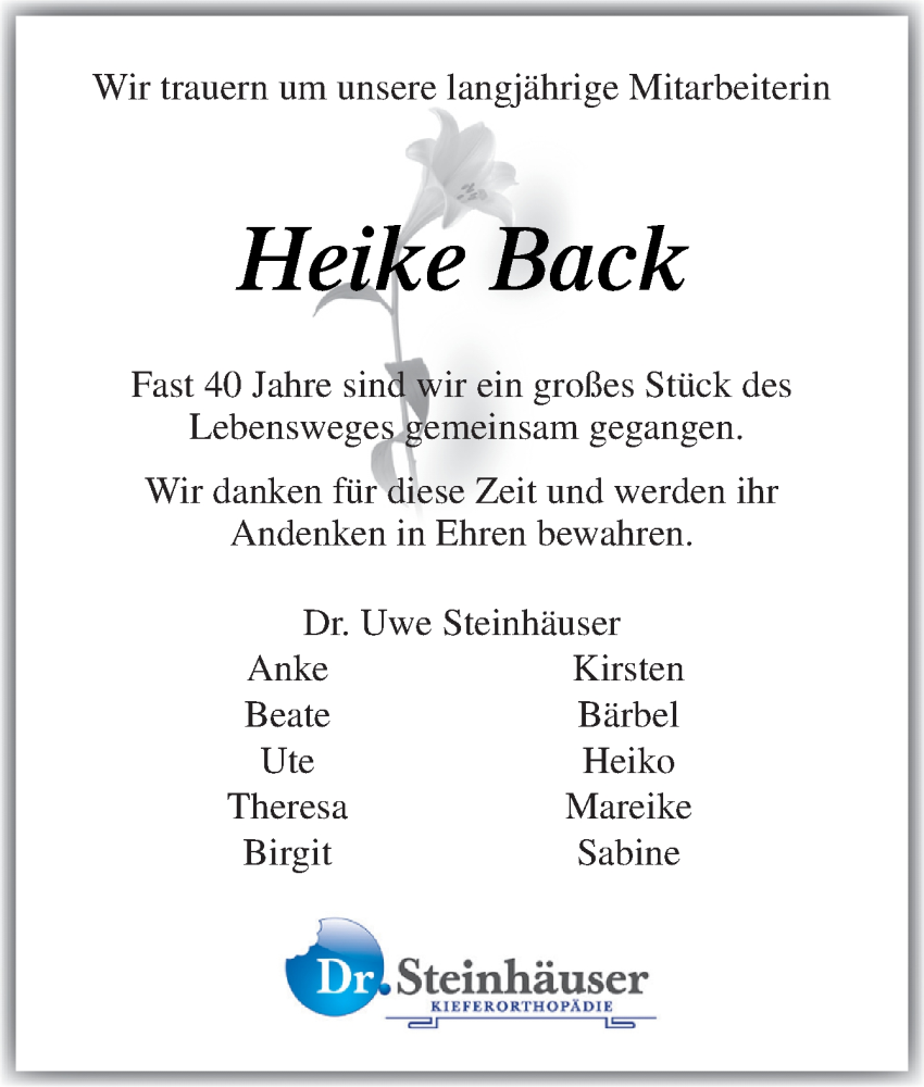 Hier finden Sie alle Traueranzeigen aus der Zeitung, die bisher für Heike Back erschienen sind. Weitere Traueranzeigen, die in der Zeitung erscheinen, werden hier ebenfalls aufgelistet