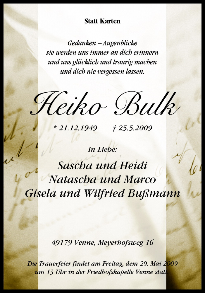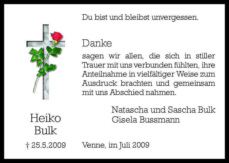 Hier finden Sie alle Traueranzeigen aus der Zeitung, die bisher für Heiko Bulk erschienen sind. Weitere Traueranzeigen, die in der Zeitung erscheinen, werden hier ebenfalls aufgelistet