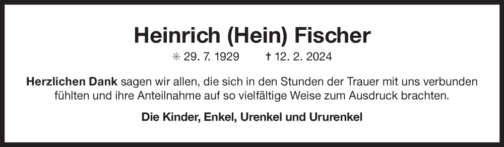 Hier finden Sie alle Traueranzeigen aus der Zeitung, die bisher für Heinrich Fischer erschienen sind. Weitere Traueranzeigen, die in der Zeitung erscheinen, werden hier ebenfalls aufgelistet