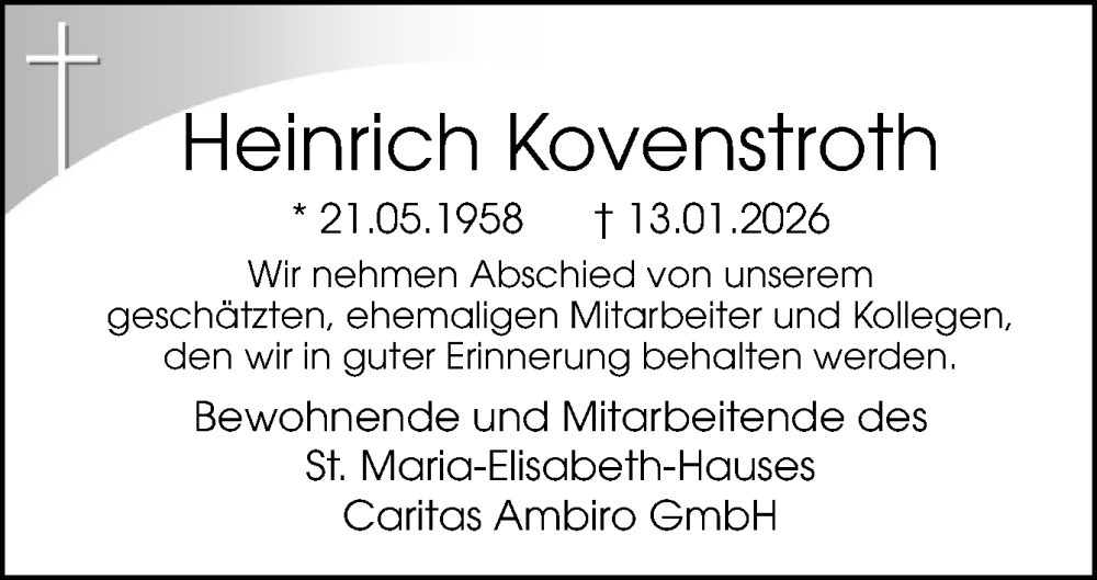 Hier finden Sie alle Traueranzeigen aus der Zeitung, die bisher für Heinrich Kovenstroth erschienen sind. Weitere Traueranzeigen, die in der Zeitung erscheinen, werden hier ebenfalls aufgelistet