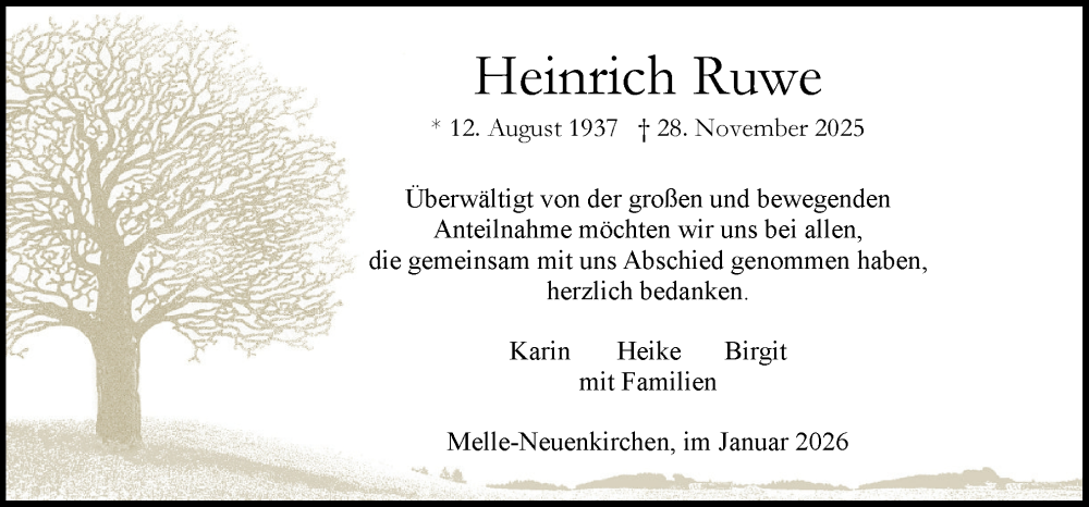 Hier finden Sie alle Traueranzeigen aus der Zeitung, die bisher für Heinrich Ruwe erschienen sind. Weitere Traueranzeigen, die in der Zeitung erscheinen, werden hier ebenfalls aufgelistet