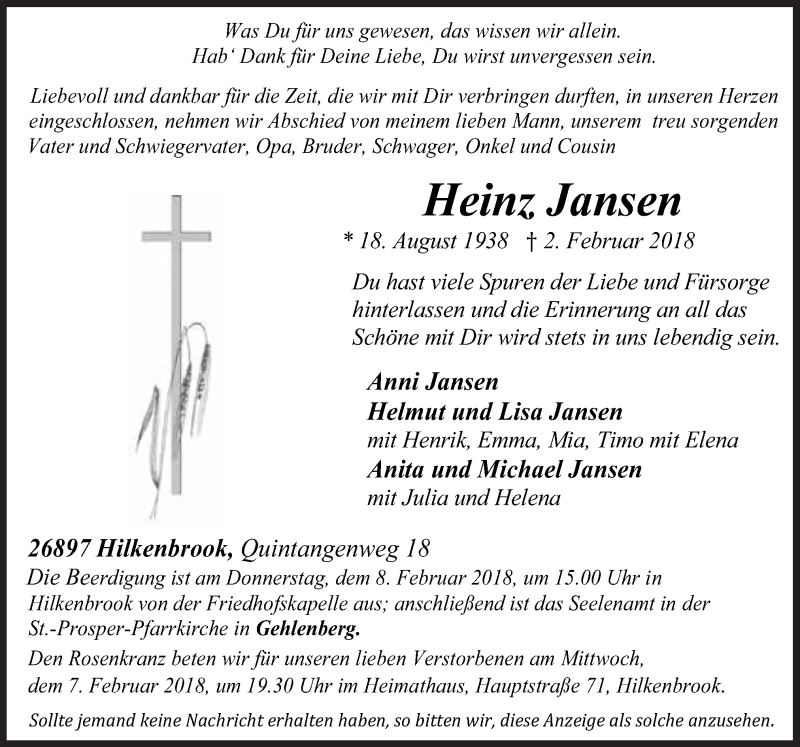 Hier finden Sie alle Traueranzeigen aus der Zeitung, die bisher für Heinz Jansen erschienen sind. Weitere Traueranzeigen, die in der Zeitung erscheinen, werden hier ebenfalls aufgelistet