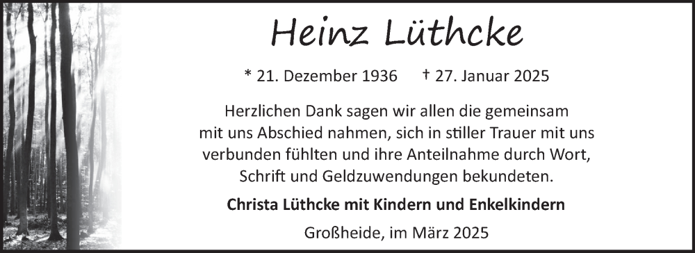 Hier finden Sie alle Traueranzeigen aus der Zeitung, die bisher für Heinz Lüthcke erschienen sind. Weitere Traueranzeigen, die in der Zeitung erscheinen, werden hier ebenfalls aufgelistet
