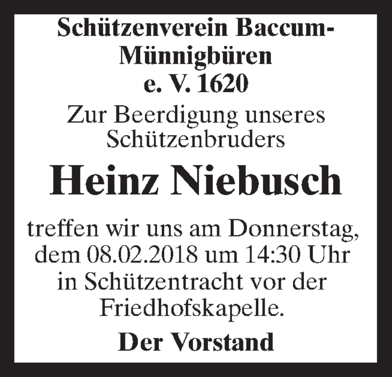 Hier finden Sie alle Traueranzeigen aus der Zeitung, die bisher für Heinz Niebusch erschienen sind. Weitere Traueranzeigen, die in der Zeitung erscheinen, werden hier ebenfalls aufgelistet
