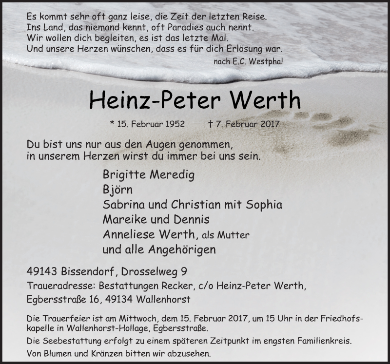 Hier finden Sie alle Traueranzeigen aus der Zeitung, die bisher für Heinz-Peter Werth erschienen sind. Weitere Traueranzeigen, die in der Zeitung erscheinen, werden hier ebenfalls aufgelistet