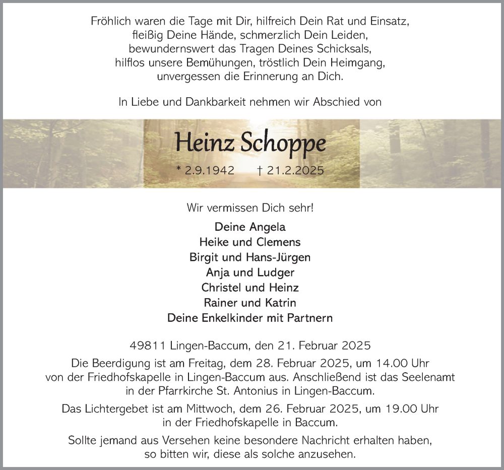 Hier finden Sie alle Traueranzeigen aus der Zeitung, die bisher für Heinz Schoppe erschienen sind. Weitere Traueranzeigen, die in der Zeitung erscheinen, werden hier ebenfalls aufgelistet