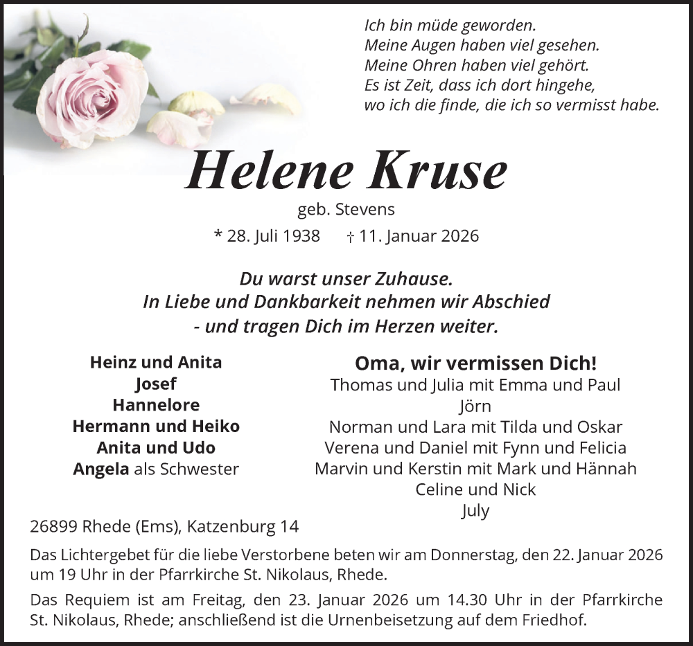 Hier finden Sie alle Traueranzeigen aus der Zeitung, die bisher für Helene Kruse erschienen sind. Weitere Traueranzeigen, die in der Zeitung erscheinen, werden hier ebenfalls aufgelistet