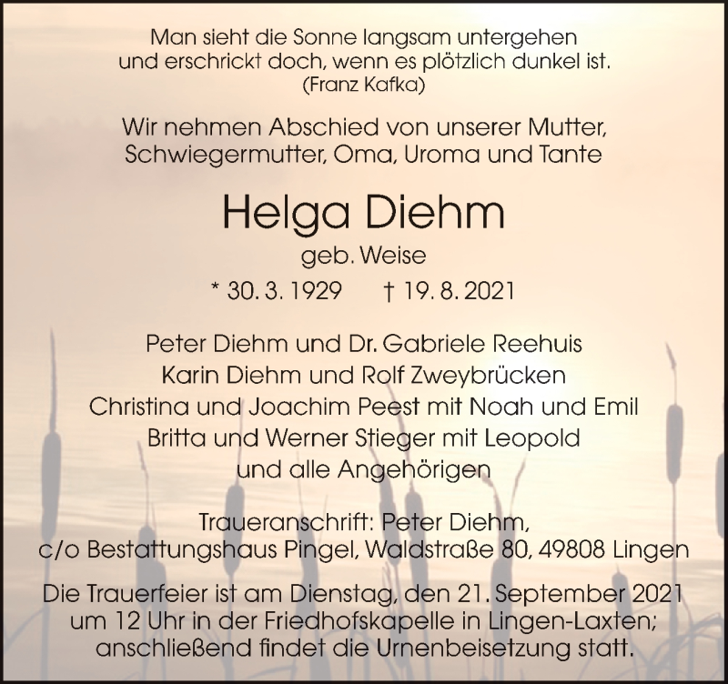 Hier finden Sie alle Traueranzeigen aus der Zeitung, die bisher für Helga Diehm erschienen sind. Weitere Traueranzeigen, die in der Zeitung erscheinen, werden hier ebenfalls aufgelistet