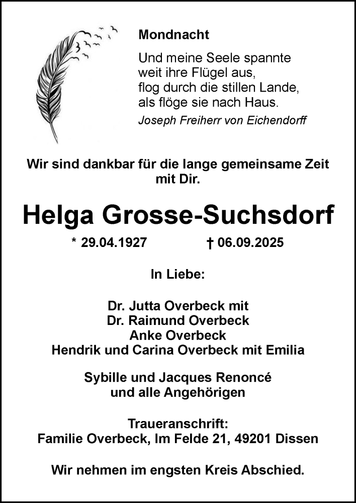 Hier finden Sie alle Traueranzeigen aus der Zeitung, die bisher für Helga Grosse-Suchsdorf erschienen sind. Weitere Traueranzeigen, die in der Zeitung erscheinen, werden hier ebenfalls aufgelistet
