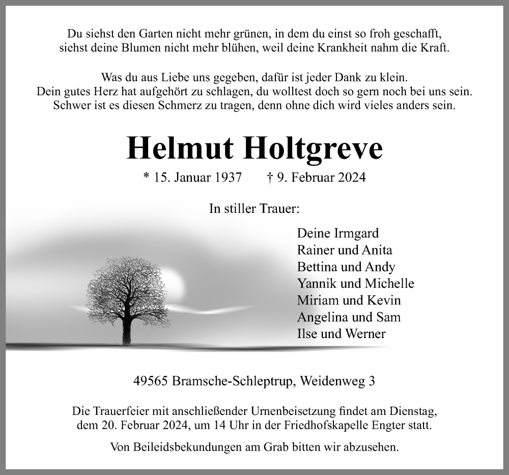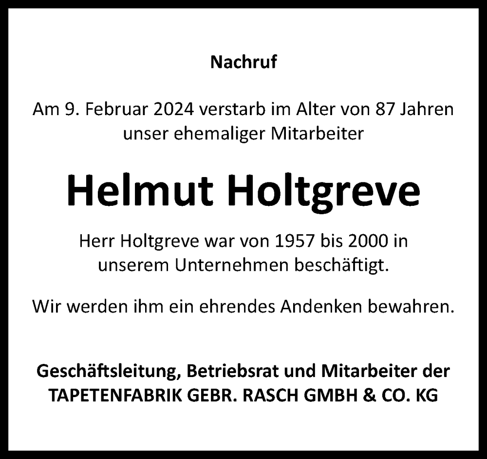 Hier finden Sie alle Traueranzeigen aus der Zeitung, die bisher für Helmut Holtgreve erschienen sind. Weitere Traueranzeigen, die in der Zeitung erscheinen, werden hier ebenfalls aufgelistet