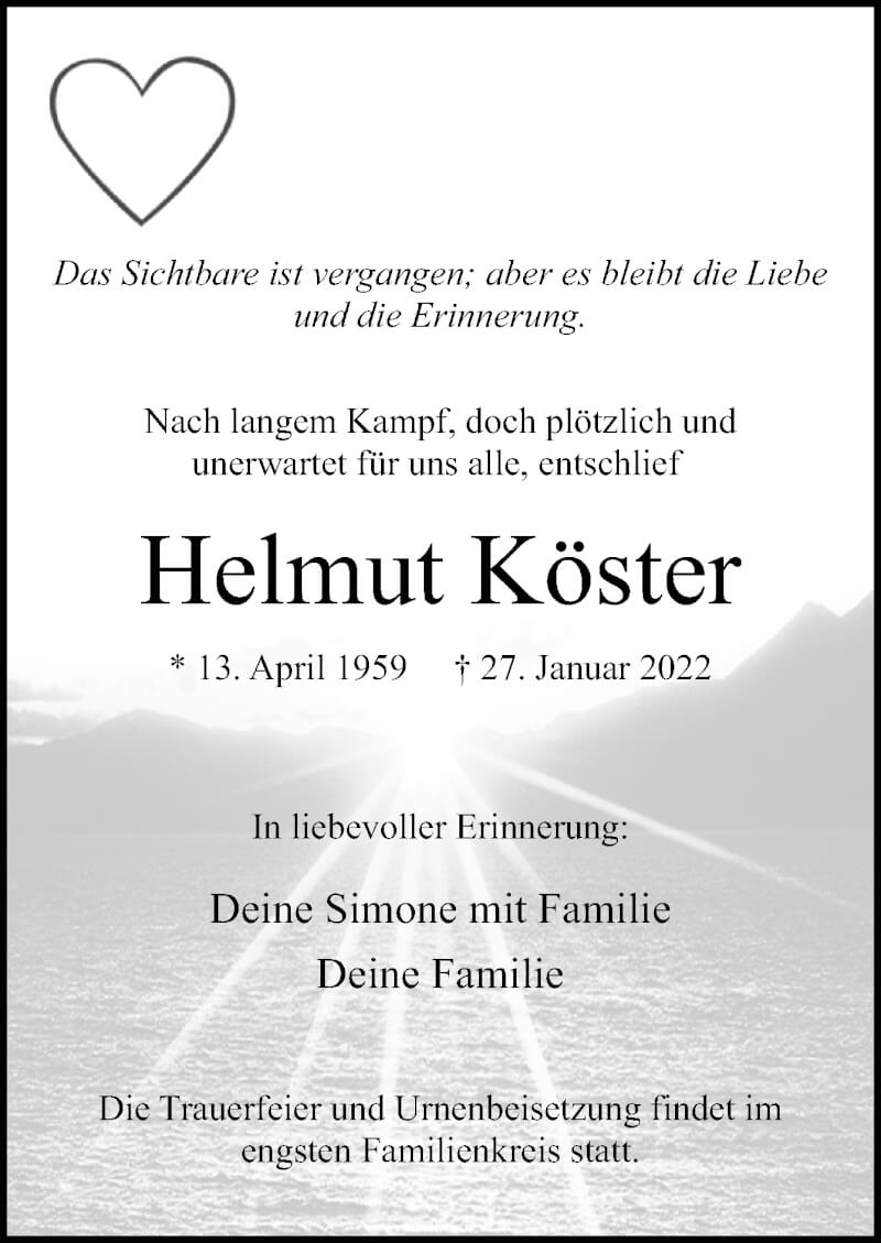 Hier finden Sie alle Traueranzeigen aus der Zeitung, die bisher für Helmut Köster erschienen sind. Weitere Traueranzeigen, die in der Zeitung erscheinen, werden hier ebenfalls aufgelistet
