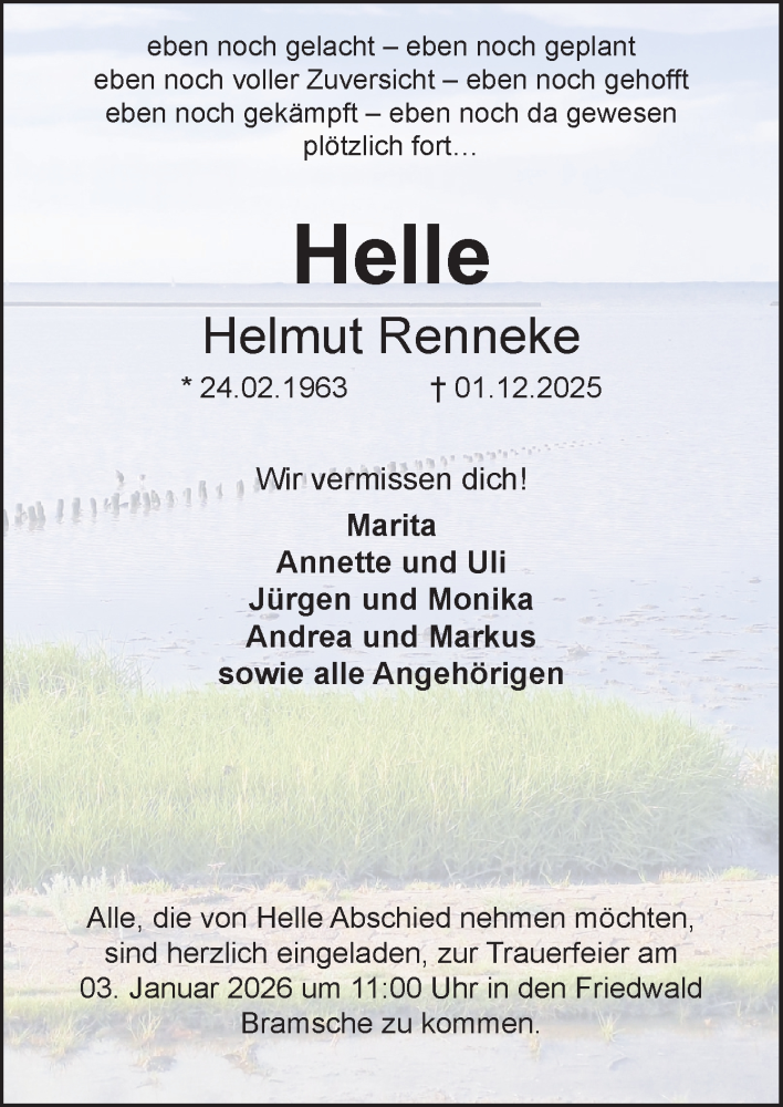 Hier finden Sie alle Traueranzeigen aus der Zeitung, die bisher für Helmut Renneke erschienen sind. Weitere Traueranzeigen, die in der Zeitung erscheinen, werden hier ebenfalls aufgelistet