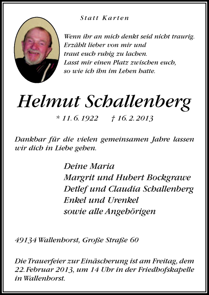 Hier finden Sie alle Traueranzeigen aus der Zeitung, die bisher für Helmut Schallenberg erschienen sind. Weitere Traueranzeigen, die in der Zeitung erscheinen, werden hier ebenfalls aufgelistet
