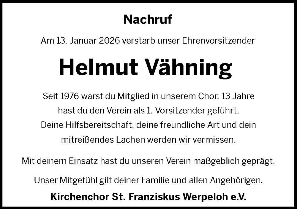Hier finden Sie alle Traueranzeigen aus der Zeitung, die bisher für Helmut Vähning erschienen sind. Weitere Traueranzeigen, die in der Zeitung erscheinen, werden hier ebenfalls aufgelistet