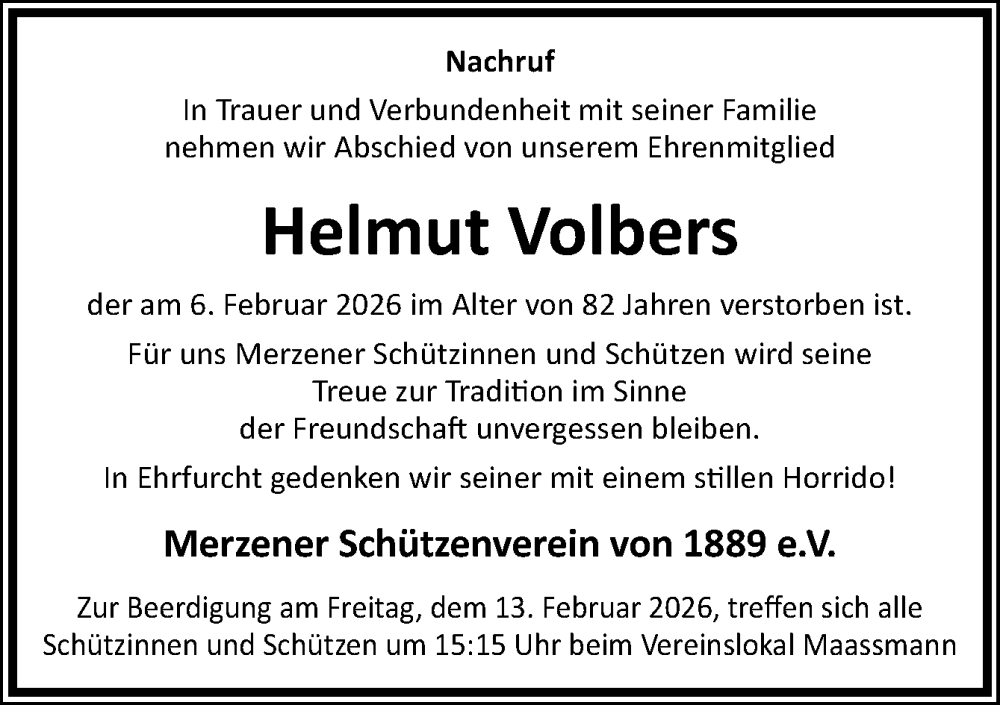 Hier finden Sie alle Traueranzeigen aus der Zeitung, die bisher für Helmut Volbers erschienen sind. Weitere Traueranzeigen, die in der Zeitung erscheinen, werden hier ebenfalls aufgelistet