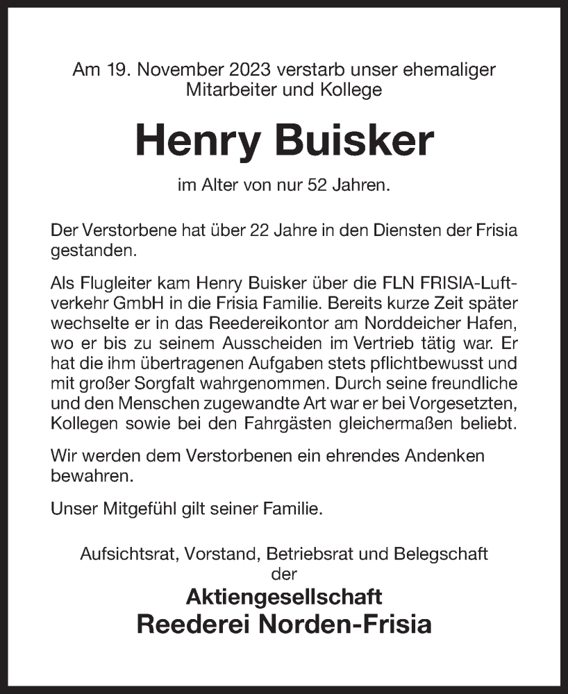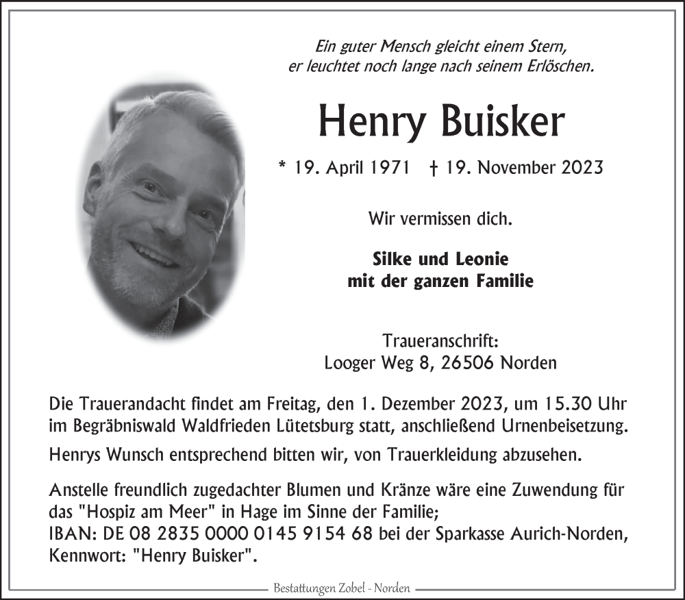 Hier finden Sie alle Traueranzeigen aus der Zeitung, die bisher für Henry Buisker erschienen sind. Weitere Traueranzeigen, die in der Zeitung erscheinen, werden hier ebenfalls aufgelistet