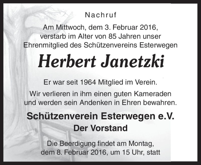 Hier finden Sie alle Traueranzeigen aus der Zeitung, die bisher für Herbert Janetzki erschienen sind. Weitere Traueranzeigen, die in der Zeitung erscheinen, werden hier ebenfalls aufgelistet