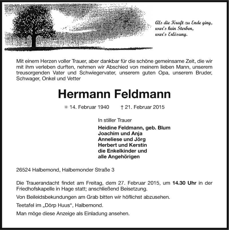 Hier finden Sie alle Traueranzeigen aus der Zeitung, die bisher für Hermann Feldmann erschienen sind. Weitere Traueranzeigen, die in der Zeitung erscheinen, werden hier ebenfalls aufgelistet