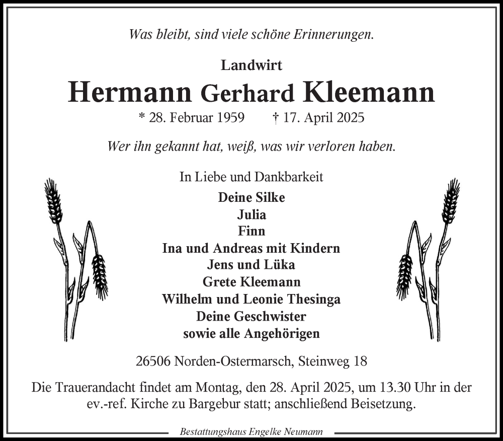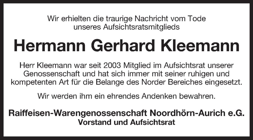 Hier finden Sie alle Traueranzeigen aus der Zeitung, die bisher für Hermann Gerhard Kleemann erschienen sind. Weitere Traueranzeigen, die in der Zeitung erscheinen, werden hier ebenfalls aufgelistet