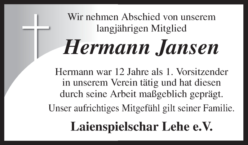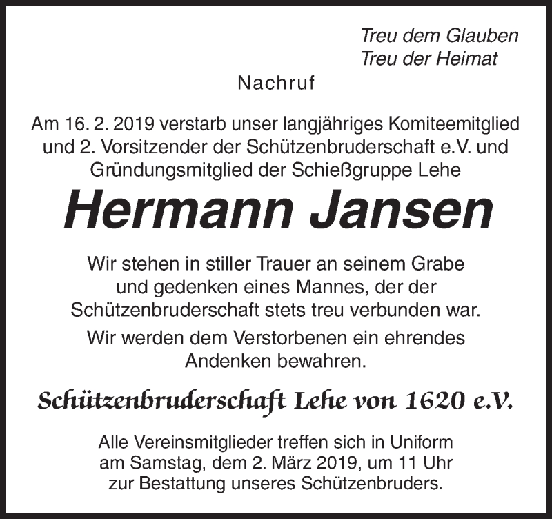 Hier finden Sie alle Traueranzeigen aus der Zeitung, die bisher für Hermann Jansen erschienen sind. Weitere Traueranzeigen, die in der Zeitung erscheinen, werden hier ebenfalls aufgelistet