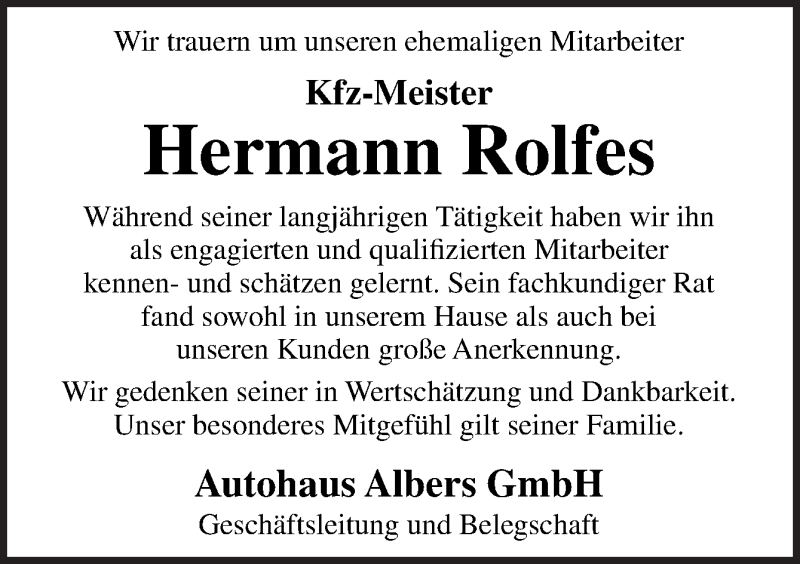 Hier finden Sie alle Traueranzeigen aus der Zeitung, die bisher für Hermann Rolfes erschienen sind. Weitere Traueranzeigen, die in der Zeitung erscheinen, werden hier ebenfalls aufgelistet