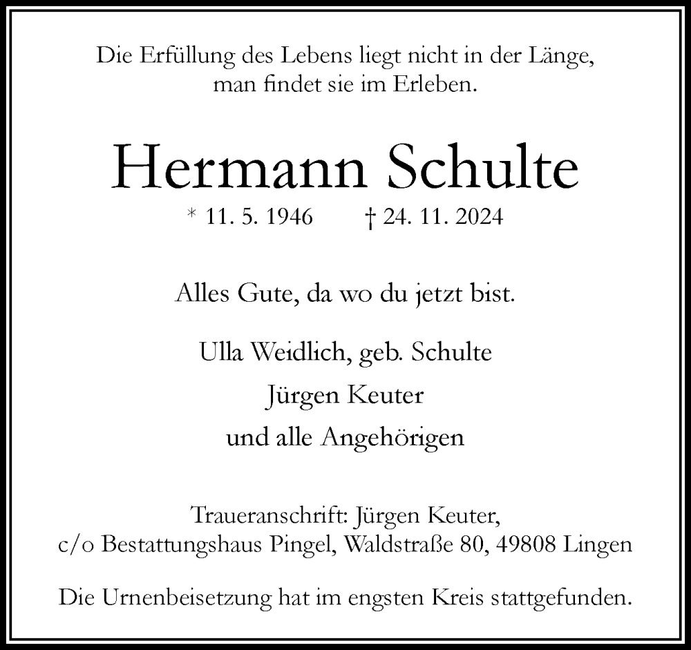 Hier finden Sie alle Traueranzeigen aus der Zeitung, die bisher für Hermann Schulte erschienen sind. Weitere Traueranzeigen, die in der Zeitung erscheinen, werden hier ebenfalls aufgelistet