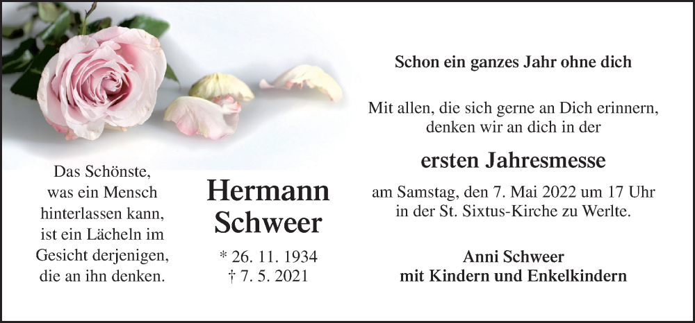 Hier finden Sie alle Traueranzeigen aus der Zeitung, die bisher für Hermann Schweer erschienen sind. Weitere Traueranzeigen, die in der Zeitung erscheinen, werden hier ebenfalls aufgelistet