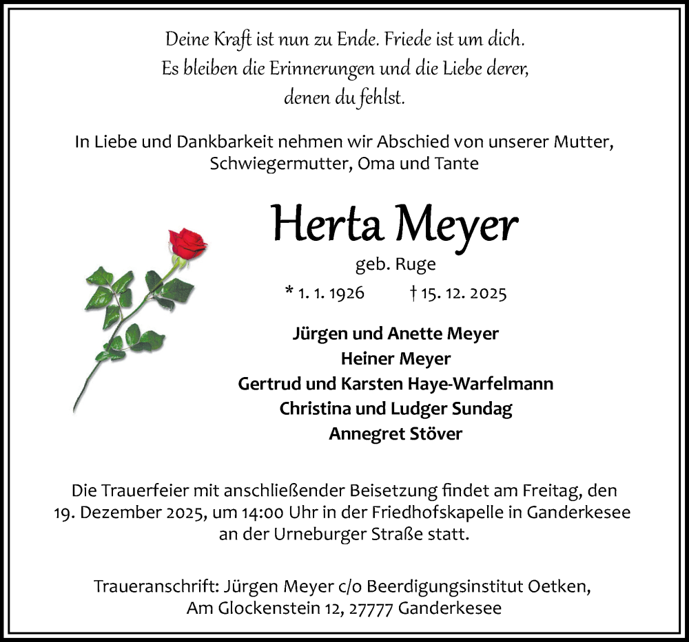 Hier finden Sie alle Traueranzeigen aus der Zeitung, die bisher für Herta Meyer erschienen sind. Weitere Traueranzeigen, die in der Zeitung erscheinen, werden hier ebenfalls aufgelistet