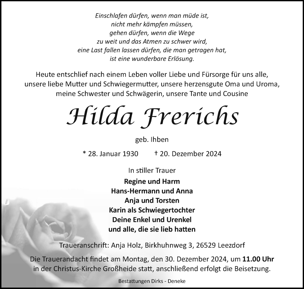 Hier finden Sie alle Traueranzeigen aus der Zeitung, die bisher für Hilda Frerichs erschienen sind. Weitere Traueranzeigen, die in der Zeitung erscheinen, werden hier ebenfalls aufgelistet