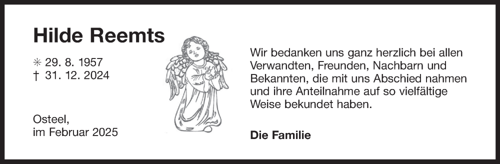 Hier finden Sie alle Traueranzeigen aus der Zeitung, die bisher für Hilde Reemts erschienen sind. Weitere Traueranzeigen, die in der Zeitung erscheinen, werden hier ebenfalls aufgelistet