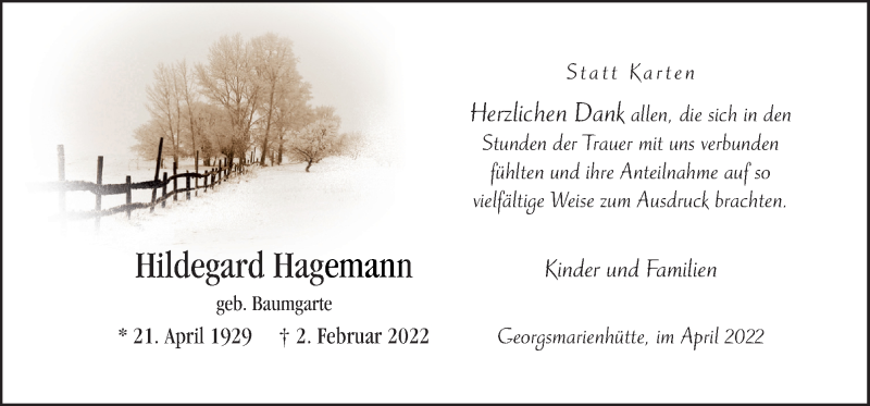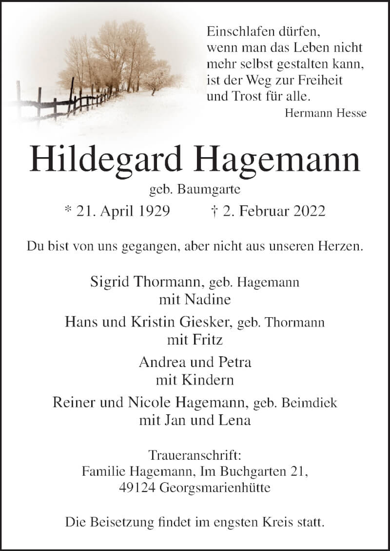 Hier finden Sie alle Traueranzeigen aus der Zeitung, die bisher für Hildegard Hagemann erschienen sind. Weitere Traueranzeigen, die in der Zeitung erscheinen, werden hier ebenfalls aufgelistet