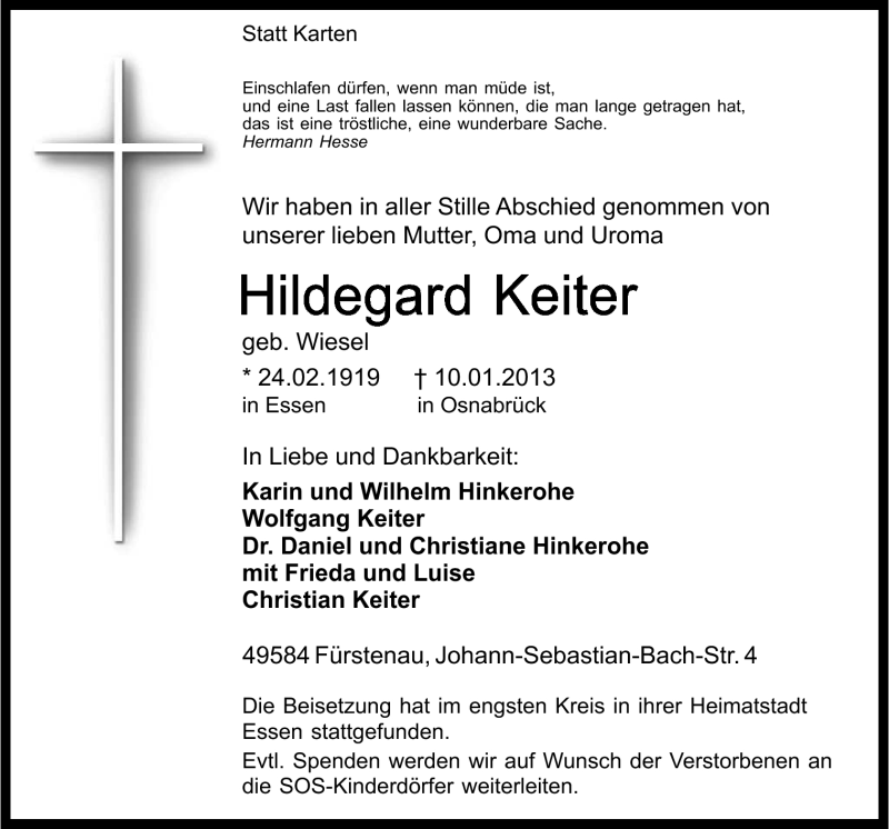 Hier finden Sie alle Traueranzeigen aus der Zeitung, die bisher für Hildegard Keiter erschienen sind. Weitere Traueranzeigen, die in der Zeitung erscheinen, werden hier ebenfalls aufgelistet
