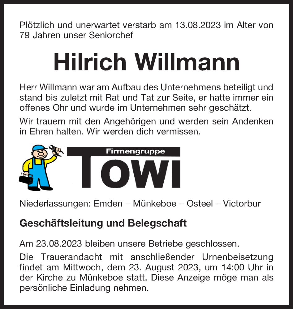 Hier finden Sie alle Traueranzeigen aus der Zeitung, die bisher für Hilrich Willmann erschienen sind. Weitere Traueranzeigen, die in der Zeitung erscheinen, werden hier ebenfalls aufgelistet
