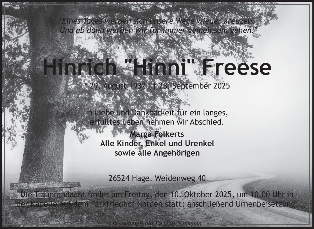 Hier finden Sie alle Traueranzeigen aus der Zeitung, die bisher für Hinrich Freese erschienen sind. Weitere Traueranzeigen, die in der Zeitung erscheinen, werden hier ebenfalls aufgelistet