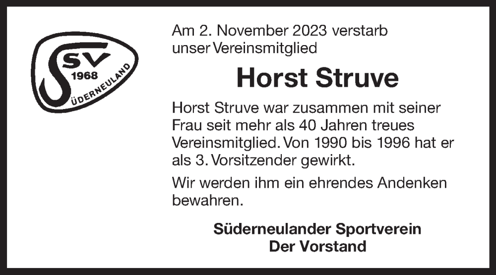 Hier finden Sie alle Traueranzeigen aus der Zeitung, die bisher für Horst Struve erschienen sind. Weitere Traueranzeigen, die in der Zeitung erscheinen, werden hier ebenfalls aufgelistet