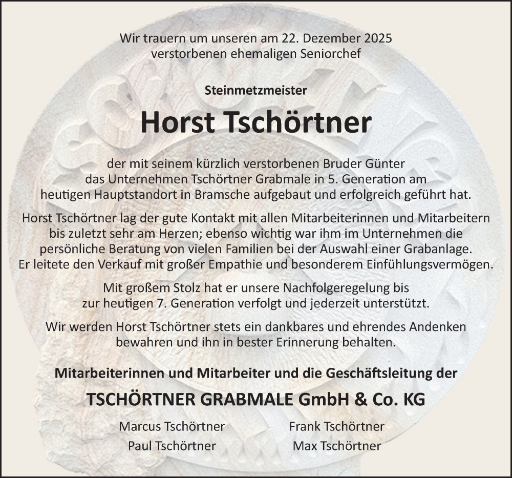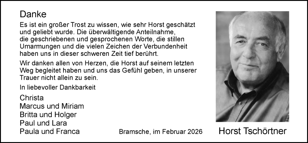 Hier finden Sie alle Traueranzeigen aus der Zeitung, die bisher für Horst Tschörtner erschienen sind. Weitere Traueranzeigen, die in der Zeitung erscheinen, werden hier ebenfalls aufgelistet