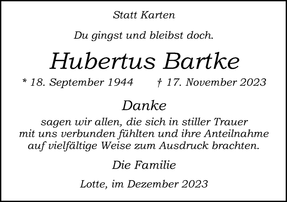Hier finden Sie alle Traueranzeigen aus der Zeitung, die bisher für Hubertus Bartke erschienen sind. Weitere Traueranzeigen, die in der Zeitung erscheinen, werden hier ebenfalls aufgelistet