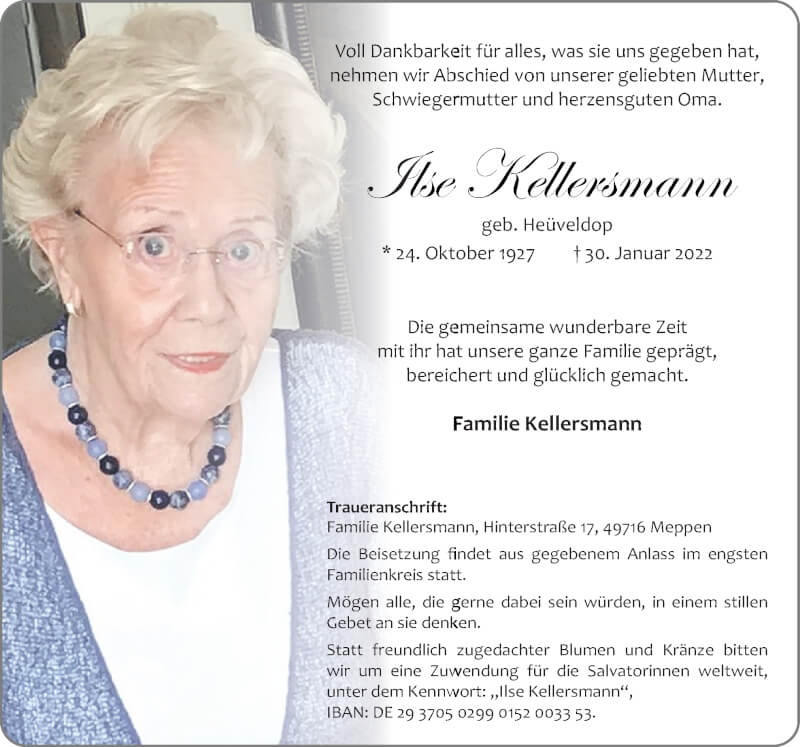 Hier finden Sie alle Traueranzeigen aus der Zeitung, die bisher für Ilse Kellersmann erschienen sind. Weitere Traueranzeigen, die in der Zeitung erscheinen, werden hier ebenfalls aufgelistet
