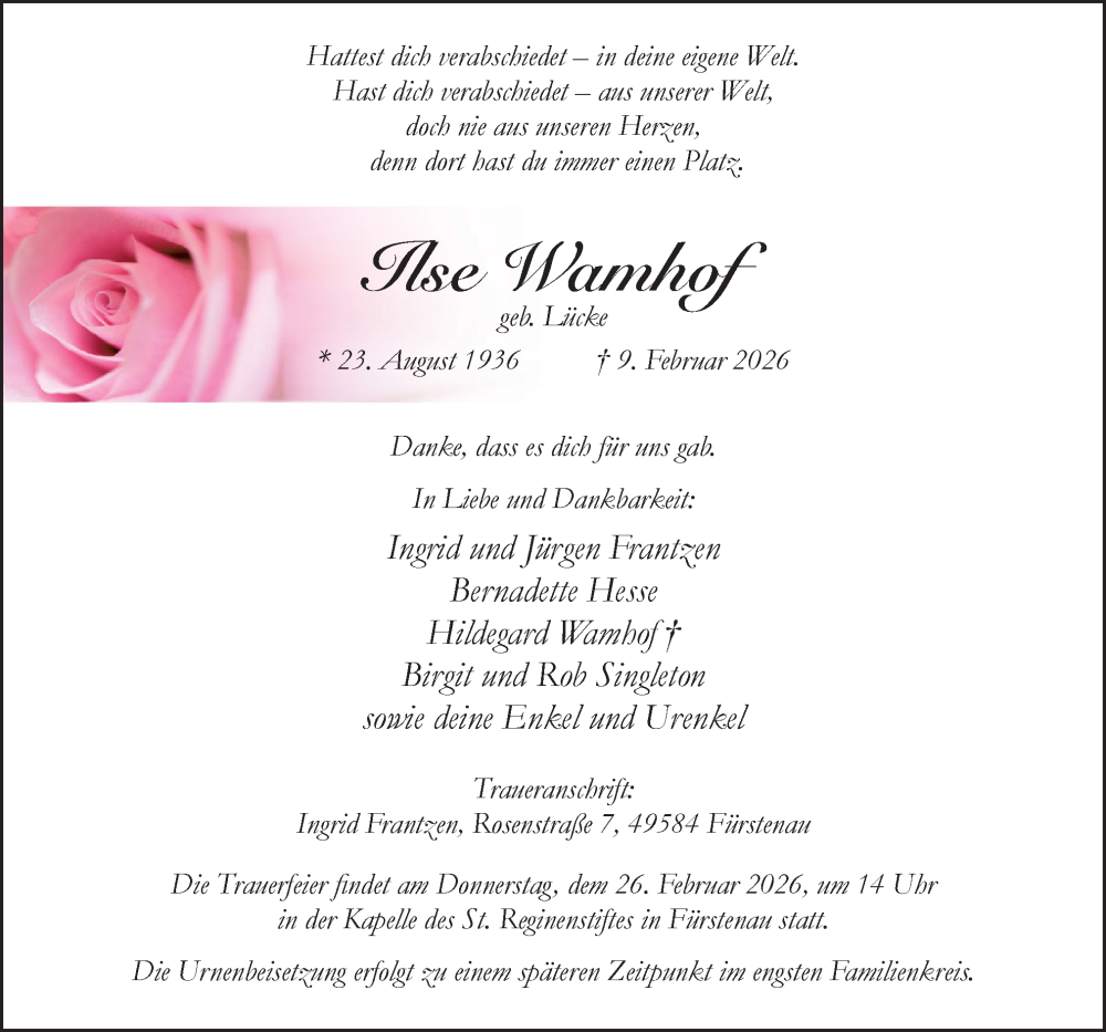 Hier finden Sie alle Traueranzeigen aus der Zeitung, die bisher für Ilse Wamhof erschienen sind. Weitere Traueranzeigen, die in der Zeitung erscheinen, werden hier ebenfalls aufgelistet
