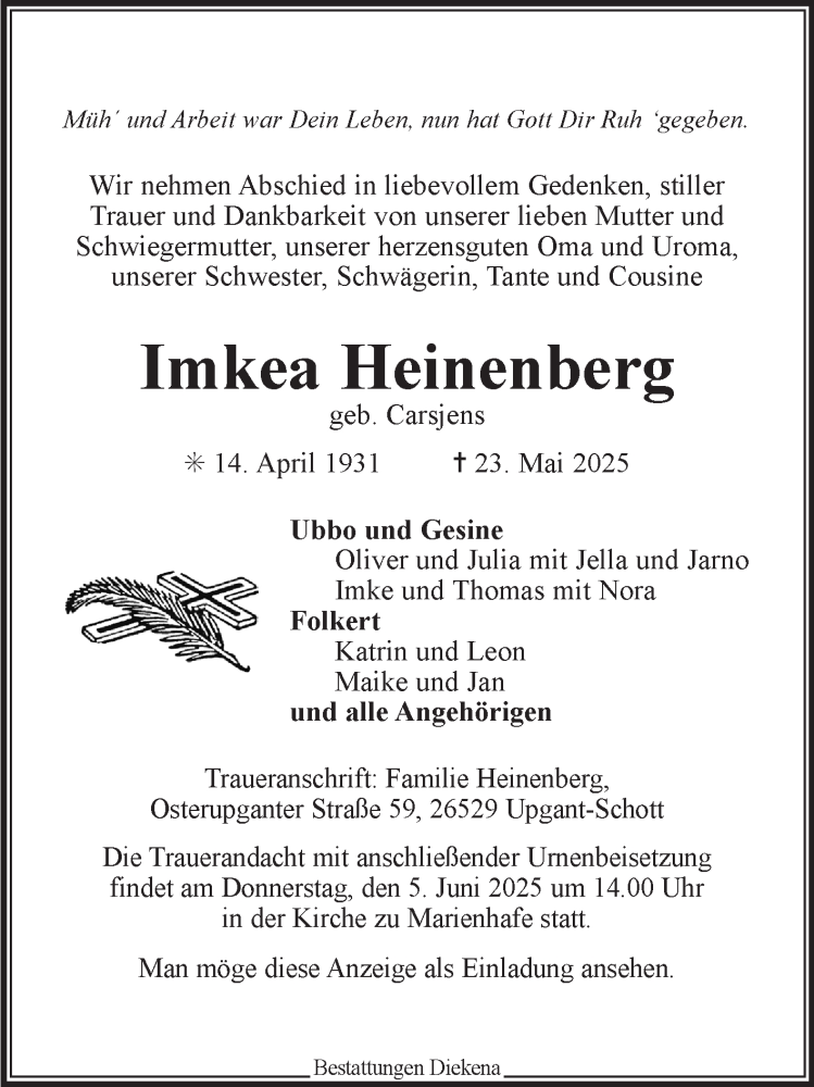 Hier finden Sie alle Traueranzeigen aus der Zeitung, die bisher für Imkea Heinenberg erschienen sind. Weitere Traueranzeigen, die in der Zeitung erscheinen, werden hier ebenfalls aufgelistet