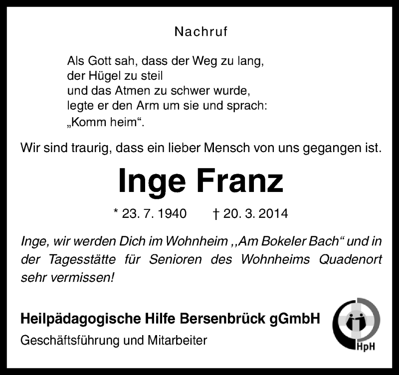Hier finden Sie alle Traueranzeigen aus der Zeitung, die bisher für Inge Franz erschienen sind. Weitere Traueranzeigen, die in der Zeitung erscheinen, werden hier ebenfalls aufgelistet