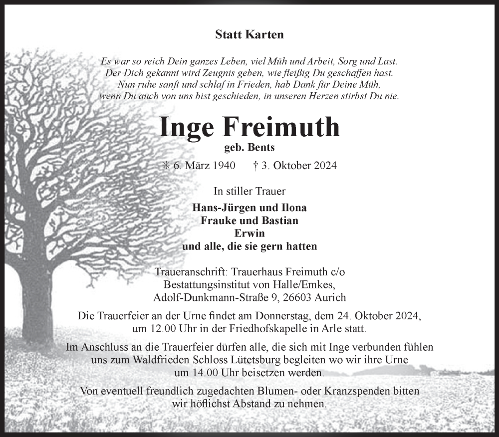 Hier finden Sie alle Traueranzeigen aus der Zeitung, die bisher für Inge Freimuth erschienen sind. Weitere Traueranzeigen, die in der Zeitung erscheinen, werden hier ebenfalls aufgelistet
